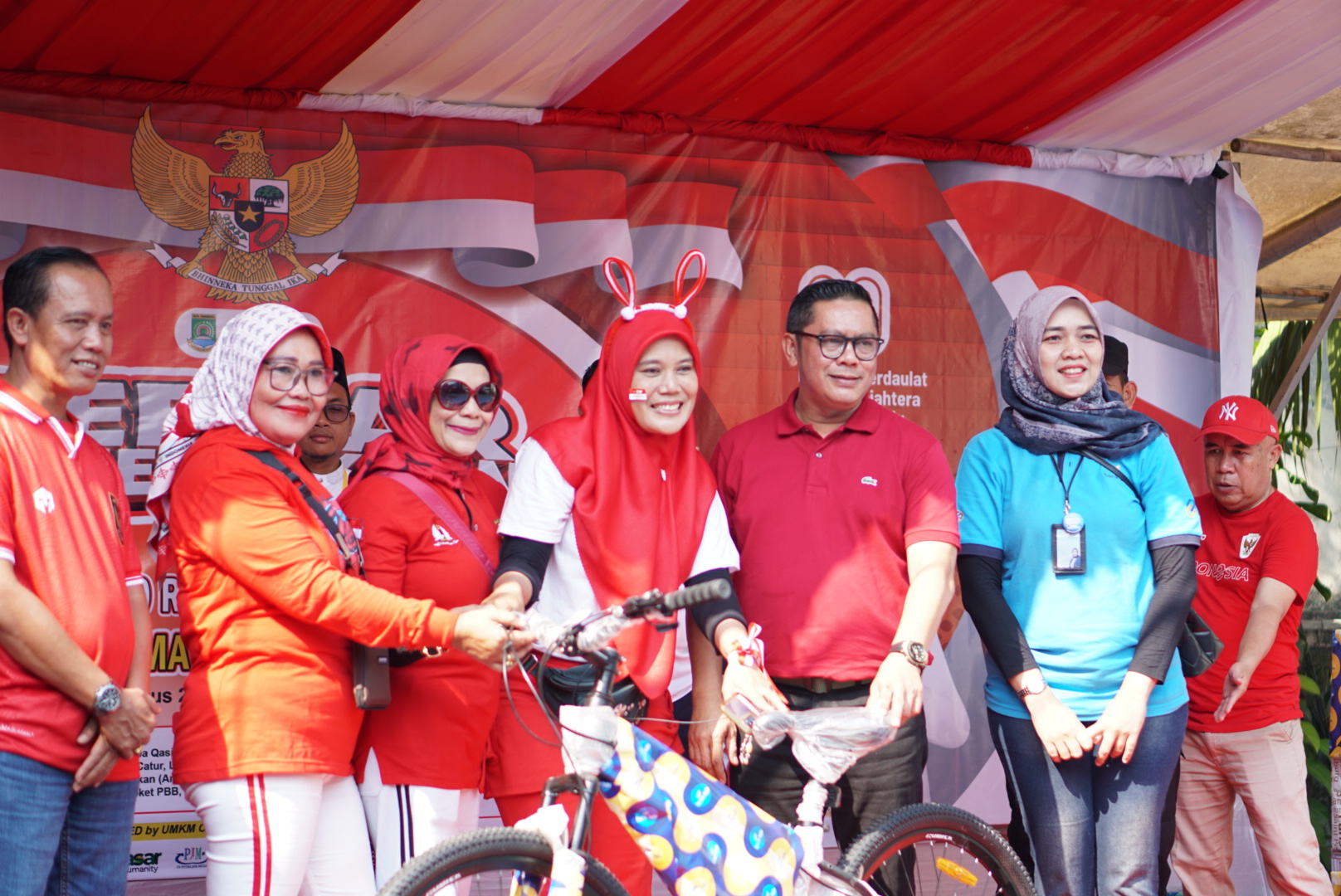 Warga juga mengenakan berbagai pakaian bernuansa merah putih untuk meramaikan acara. Pemenang lomba kostum terbaik, Wahyu Wastuti asal Gebang Raya memadu padankan pakaian tradisional kebaya purih dan batik merah dengan hiasan yang dibuat dari plastik daur ulang.