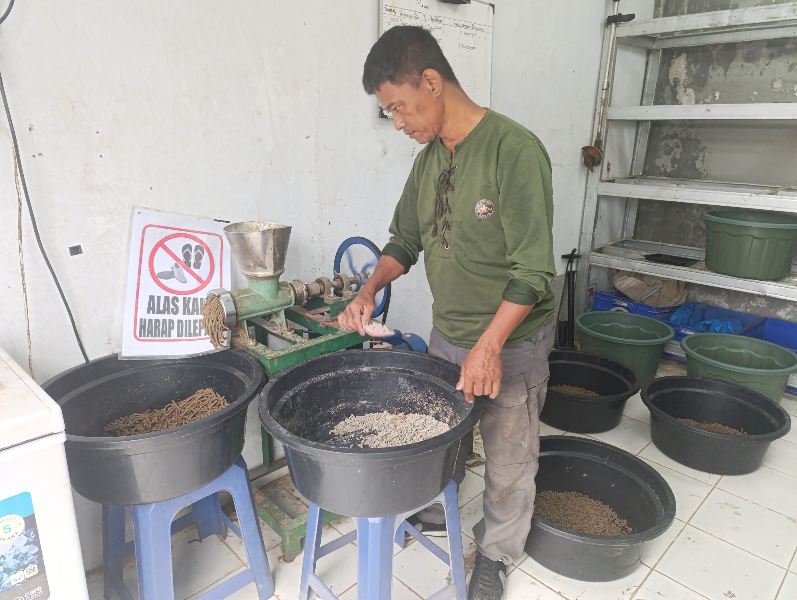 “Setelah sampah sayuran habis dimakan magot, kita jadikan magot sebagai tepung lalu tulang ayam dan tulang ikan digiling dicampurkan ampas kelapa dan ditambah komponen lainnya, baru jadilah pelet ikan berkualitas,” jelasnya.